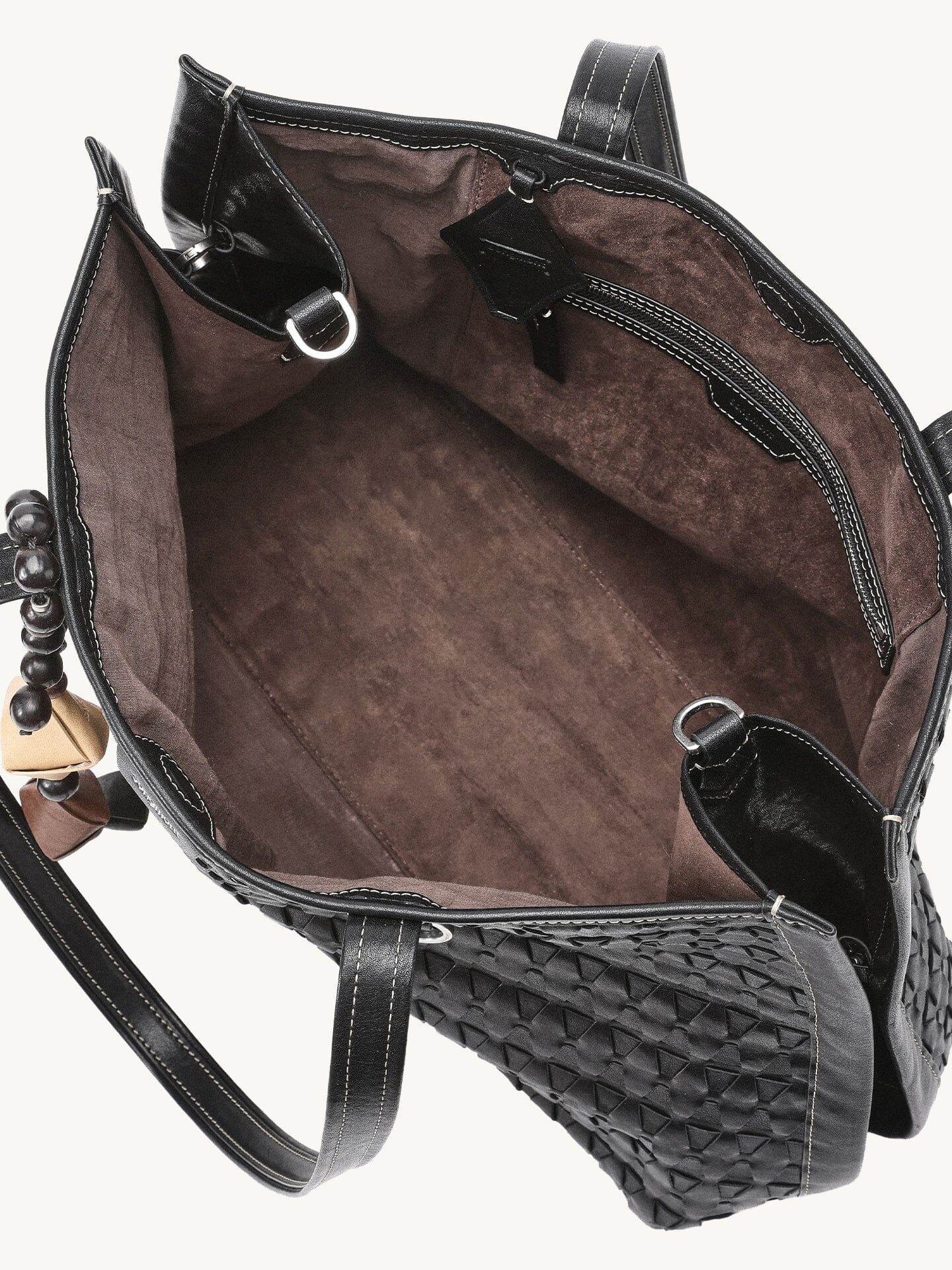 The diamond-quilted interior gives the bag a soft, structured shape.