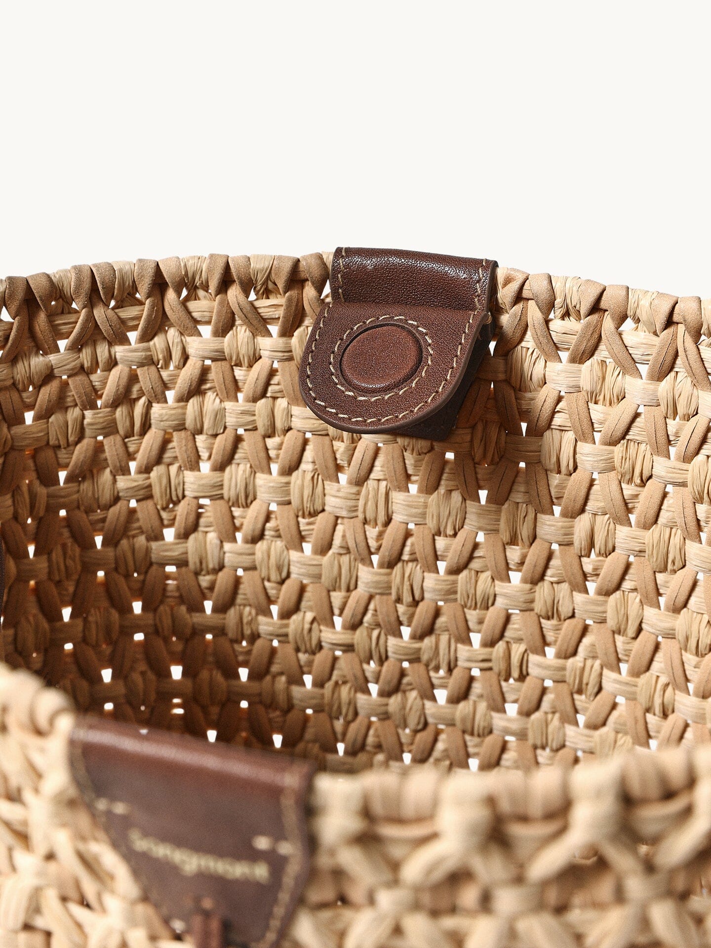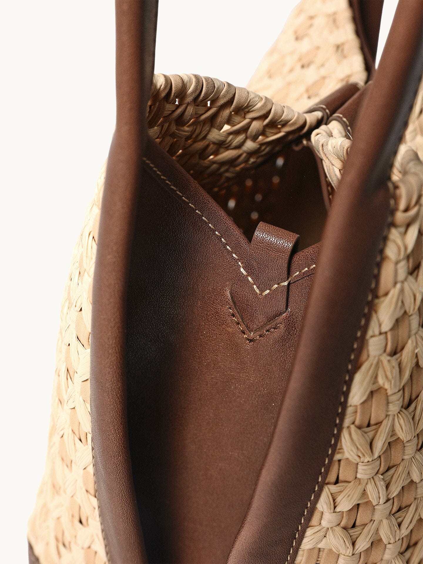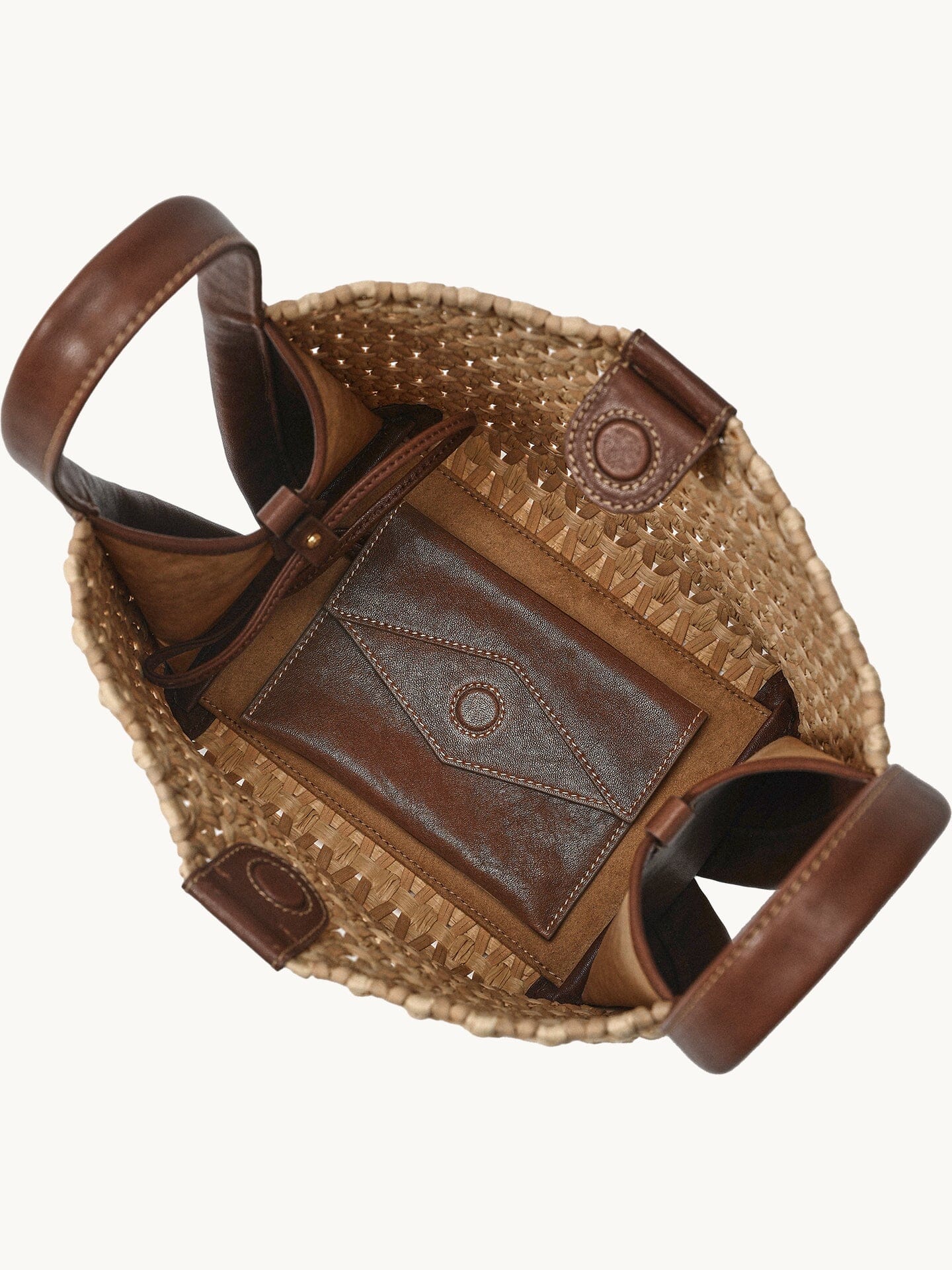 The blend of supple leather and crinkled palm fronds creates a richly dimensional surface that is both soft and structured. Basket-style vegetable-tanned leather side strips function as handles and supports, securely fixed with refined stitching.
