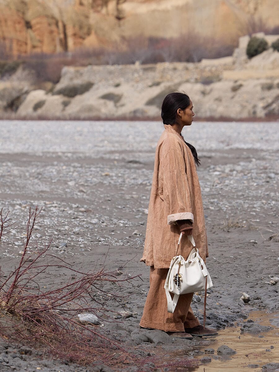 - Desert-tote inspired, the bag embodies nomadic gathering joy.